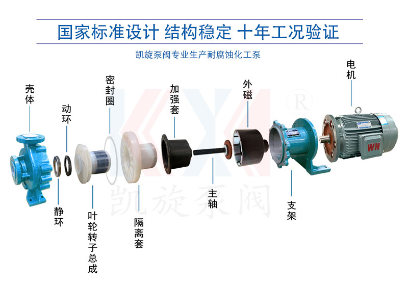 IMC氟塑料磁力泵,利用內(nèi)外永磁體傳動,實(shí)現(xiàn)扭矩?zé)o接觸傳遞,當(dāng)電動機(jī)帶動外轉(zhuǎn)子總成旋轉(zhuǎn)時,通過磁場的作用磁力線穿過隔離套帶動內(nèi)轉(zhuǎn)子總成和葉輪同步旋轉(zhuǎn),隔離套將介質(zhì)完全密封,從而達(dá)到無泄漏輸送介質(zhì)的目的。過流部件采用氟塑料及高純度碳化硅制成,具有良好的耐腐蝕性和密封性,可輸送甲醇、乙醇、甲苯、氯苯、苯酚、乙醚等有機(jī)溶劑和易燃易爆揮發(fā)性強(qiáng)腐蝕性強(qiáng)的介質(zhì)。